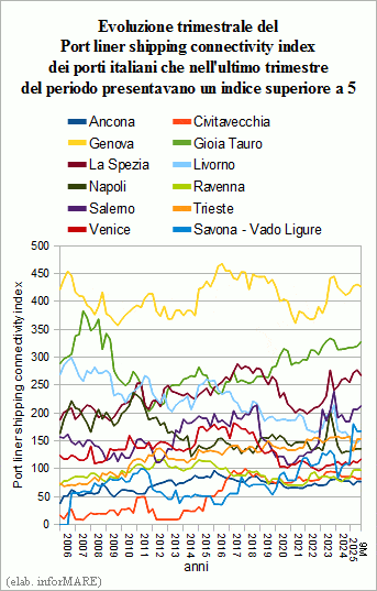 With regard to the degree of connection of the individual Italian ports global network of containerized shipping services that is assessed by the Port Liner Shipping Connectivity Index (PLSCI) of UNCTAD, the greatest decline in the index is was the port of Trapani with a PLSCI of 22.7 (-9.9%) followed by the ports of Livorno with 185.8 (-8.2%), Civitavecchia with 82.3 (-4.0%), Trieste with 153.7 (-1.5%) and Ancona with 77.3 (-0.9%). The most marked growth in PLSCI was recorded by the port of Savona-Vado Ligure with an index of 167.5 (+53.7%) followed by ports of Taranto with 27.4 (+39.5%), Cagliari with 34.5 (+32.1%), Augusta 26.7 (+24.1%), Ravenna with 97.7 (+17.4%), Salerno with 212.8 (+15.1%), Palermo with 23.2 (+9.2%), Venice with 117.5 (+4.7%), Naples with 136.3 (+3.9%), Gioia Tauro with 328.1 (+3.8%), Genoa with 427.1 (+3.7%), La Spezia with 267.7 (+2.1%) and Marina di Carrara with 26,5% (0%).
