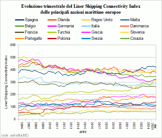 Among the main European maritime nations, to total the Sweden was the largest decline in its LSCI index, with an index of 116.1 (-2.2%) followed by France with 261.3 (-1.9%), Spain with 421.1 (-1.5%), Belgium with 344.0 (-0.8%) and Portugal with 182,5 (-0,3%). The largest increase in the LSCI index was recorded by Turkey with an index of 317.0 (+15.8%) followed by Poland with 142.6 (+10.5%), Germany with 323.3 (+6.3%), Denmark with 91.8 (+5.0%), United Kingdom with 396.5 (+4.7%), Croatia with 62.5 (+3.4%), Italy with 289.9 (+2.7%), Slovenia with 77.2 (+1.5%), Malta with 110.6 (+1.3%), Greece with 176.2 (+0.6%) and Holland with 378.7 (+0.3%).