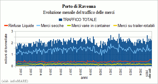 Au cours des huit premiers mois de 2025, le port de Ravenne traité un total de 17,91 millions de tonnes de fret, avec une hausse de +6,0 % par rapport à la même période l’an dernier, dont 16,88 millions de tonnes de vrac liquide (+16,9 %), 7,57 millions de tonnes de vrac sec (+10,9 %), 3,92 millions de tonnes de fret sec en vrac tonnes de biens conventionnels (-5,9 %), 1,59 million de tonnes tonnes de fret conteneurisé (+4,3 %) avec un de conteneurs soit 144 mille EVP (+4,5 %) et 1,09 million de tonnes du matériel roulant (-7,5 %). Dans le secteur des croisières, le trafic est 187 mille passagers (-3,4 %).