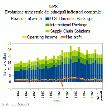 In the third quarter of this year, the financial performance of the UPS logistics group have recorded a decline since revenues that, with 21.41 billion dollars, marked a drop of -3.7% over the same period in 2024, of which 14.22 billion generated from express deliveries made in the United States (-2.6%), 4.67 billion from international express deliveries (+5.9%) and 2.52 billion billion from other supply chain solutions (-22.1%). In the operating costs amounted to €19.61 billion (-3.2%). Operating profit was $1.80 billion (-9.1%), with a contribution of €603 million from express deliveries in the USA (-28.5%), 676 million from express deliveries international (-15.3%) and 525 million from other solutions logistics (+52.6%). Net profit was 1.31 billion dollars (-14.8%).