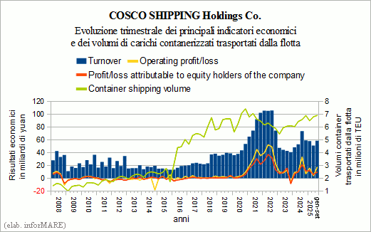 To attenuate the effect on the quarterly revenues of the decrease of the value of the marine hires is not enough the increase of +4.9% of the volumes of containerized cargos transported from the fleet of the Chinese group in the period. In the trimester July-september of 2025, in fact, the revenues of COSCO Shipping Holdings Co. are results pairs to 58,50 billion yuan (8,2 billion dollars), with a decrease of the -20,4% on the correspondent period last year, of which 56,23 billion yuan generated from the activity of containerized marine transport (- 21.2%).