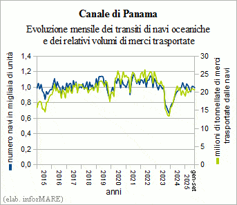 In the third quarter of this year, maritime traffic in the Panama Canal was 3,213 ships, an increase of +7.0% on the corresponding period of 2024, of which 3,015 ships of high draught (+6.8%) including 909 Neopanamax vessels (+12.4%). The net PC/UMS tonnage of ships transited amounted to 125.5 million tons (+5.2%). The ships that have crossed the Central American Canal carried a total of 62.6 million tons, with a decrease of -0.4% on the third quarter last year. Transit fees paid by ships transited totaled $1.05 billion (+14.1%).