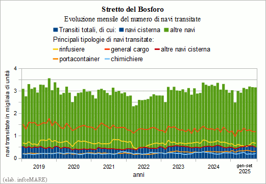 In the third quarter of this year, the Bosphorus Strait was A total of 10,329 ships transited, with a decrease of -0.5% over the same period of 2024, for a total of 169.3 million gross tonnage (+2.7%). Tanker transits are 2,404 (-0.1%) and those of other types of ships 7,925 (-0,6%). In particular, among the main types of ships transited, in the period July-September 2025 the Strait was crossed by 3,654 general cargo ships (-3.2%), 2,005 bulk carriers (-10.6%), 963 container ships (+9.6%) and 604 chemical tankers (+1,7%).