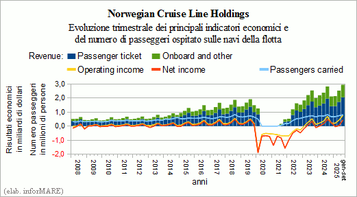 In the third quarter of this year, the group's revenues American cruise line Norwegian Cruise Line Holdings (NCLH) are amounted to a record $2.94 billion, a value that represents an increase of +4.7% over the same period in 2024 when the previous historical peak was recorded and Composed of the new record in the value of the sale of cruises which was equal to 2.05 billion (+5.4%) and from the new record of the value of sales on board ships amounted to 888.2 million dollars (+3.1%). New records were also set from the gross operating margin, equal to 1.01 billion (+15.7%), and from the operating profit which totaled 749.4 million (+8.4%). Net income was $419.3 million, a value that represents a decrease of -11.7% deriving from the increase in the financial charges.