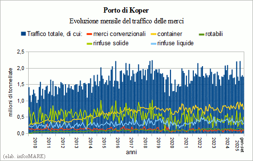 Last September, the port of Koper handled 1.74 million tonnes of goods, with a decrease of -3.0% on the previous year. September 2024 caused by the -5.7% drop in rolling stock traffic (134 thousand tons) and the -21.8% reduction in that of liquid bulk (292 thousand tons). Growing goods in containers with 739 thousand tons (+1.6%), conventional goods with 84 thousand tons (+13.4%) and dry bulk with 500 thousand tons (+3.0%).
