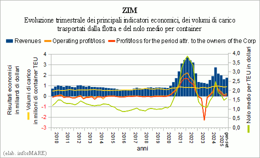 In the first nine months of this year, ZIM's revenues were of $5.42 billion, down -13.4% on the previous year. corresponding period of 2024. Ebitda is profit of €1.84 billion (-31.8%), operating profit of €872.9 billion million (-53.3%) and net income at $443.2 million (-72,1%). During the period, the container fleet transported 2.77 million TEUs, volume unchanged from that of the same period of 2024.
