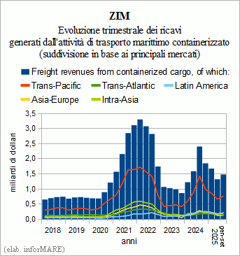 In particular, the largest volume of traffic, the on the transpacific routes, amounted to 414 thousand TEUs (-1.7%) and the revenues generated in this market were amounted to $767.5 million (-46.2%). The containers transported by the intra-Asian services of the Israeli company amounted to 195 thousand TEUs (+4.3%) and the related revenues were equal to $208.3 million (-16.1%). On the routes with America Latina traffic was 133 thousand TEUs (+2.3%) and The business generated revenues of $214.0 million (-16,8%). ZIM's transatlantic services transported 113 thousand TEUs (-19.3%) and the related revenues amounted to 157.0 million dollars (-13.7%). Finally, on the Asia-Europe routes - market that is the most affected by the effect of the crisis in the Red Sea that has forced most maritime carriers to avoid transits through the Suez Canal and was found to be be the most unsatisfactory for the ZIM - traffic handled was 71 thousand TEUs (-22.8%) and revenues in This market amounted to $136.2 million (-53.0%).
