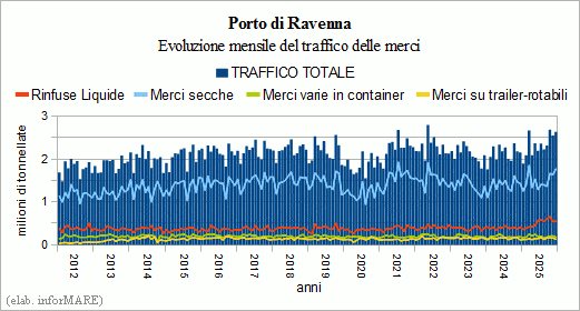 In 2025, with a total of 28,096,272 goods handled, the port of Ravenna has recorded its new historical record of annual traffic and an increase of +10.0% over the previous year as well as a growth of +2.6% on the previous historical peak scored in 2022. The new record was reached, in in particular, thanks to the quantity of goods never reached in precedence only in the fourth quarter of the year, since the period October-December 2025 ended with a record total of 7,865,987 tons, up +17.4% on the last quarter of the previous year. The new quarterly all-time record also was obtained thanks to the new records relating to the single month recorded by the volumes of traffic handled in recent months of October, November and December: if in October 2025 there were 2,683,696 tons of cargo handled, with an increase of +13.4% on the same month last year, in November 2025 the figure traffic was 2,549,260 tons (+17.1%) and the following month of about 2,633,054 tons (+22,1%).