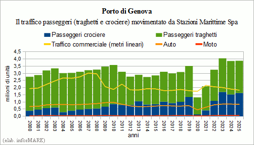 In 2025, passenger traffic in the port of Genoa is result in line with that of the previous year, having been almost 3.9 million people, with a slight increase of +0.4% on the previous year. 2024. Stazioni Marittime Spa, the company that manages this traffic flow in the port, highlighting that in 2025 This flow was second only to the historical record of the 2023, announced that last year in the cruises 334 ship calls were recorded with 1,630,593 cruise passengers (+6.5%), of which 620,195 as home ports (+3.4%) and 1,010,398 in transit (+8.5%). The company specified that in 2025 the presence of MSCs was important and in the majority Cruises that brought 234 calls to the Genoese terminals with over 1.23 million passengers, reaffirming traffic leadership Cruises in the port. The numbers recorded by Costa Cruises which called the port of Genoa weekly with a ship for the entire season and has made several cruises in the autumn season, bringing a total of 52 calls in 2025 and of about 332 thousand passengers (+5 calls and + 17 thousand pax compared to the previous year). 2024). Stazioni Marittime also emphasized the presence for the first time in the port of Genoa of the Explora Journeys company, MSC Group is a new brand of the MSC Group that operates in the luxury segment of the cruise market, with the ships Explora I and Explora II which in 2025 made a total of six stopovers in Genoa handling about 5 thousand passengers. It is also always important to presence in Genoa of Princess Cruises which with 10 stopovers has handled over 40 thousand passengers