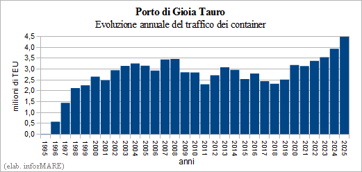 After a marked increase of +11.0% recorded in 2024, had led to a new record, in 2025 the port of Gioia Tauro marked an even more significant increase in traffic containerized which has again reached an all-time high of 4,490,566 TEUs handled, with a growth of +14.0% on the year previous. Commenting on the new record, the Authority's president of Port System of the Southern Tyrrhenian and Ionian Seas, Paolo Piacenza, highlighted that "2025 confirms the centrality of of the Port of Gioia Tauro in international maritime traffic".