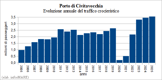 La Autoridad del Sistema Portuario del Mar Tirreno Central Settentrionale destacó que la cifra de 2025 representa un nuevo récord absoluto para el sistema portuario italiano, superando el umbral de 3,5 millones de pasajeros de cruceros por primera vez y se consolida el papel estratégico de Civitavecchia en el panorama mundial de cruceros, tanto como puerto de tránsito como, sobre todo, como puerto de embarque y desembarco (puerto base).