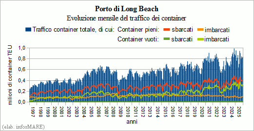 Il nuovo record annuale del porto di Long Beach si è prodotto essenzialmente nel primo trimestre del 2025 quando era stata totalizzata una crescita anno su anno del +19,8%. Nell'ultimo trimestre del 2025, invece, il traffico containerizzato è calato del -8,8% sullo stesso periodo dell'anno precedente essendo ammontato a 2,49 milioni di teu, di cui 1,19 milioni di teu pieni allo sbarco (-10,4%), 312mila teu pieni all'imbarco (-6,1%) e 984mila teu vuoti (-7,7%).