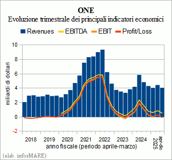 In the last quarter of last year, the downward trend in the company's financial results Ocean Network Express (ONE) containerized shipping, with revenues which amounted to $4.07 billion in the period, down -15.9% over the corresponding period of 2024. The operating margin gross was 536 million (-66.1%). Operating result and net economic result fell into negative territory as they recorded decreases of -108.0% and -107.6% and having settled at -84 and -88 million dollars.