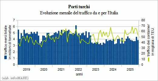 New all-time peak of containers with Italy equal to 678,715 TEUs (+9.8%). Drop in ship transits through the Bosphorus Strait