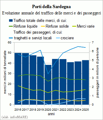 In 2025, with a total of 42.9 million tonnes, the traffic of goods in the ports of Sardinia recorded a increase of +3.0% on the previous year, with a decrease of -1.6% of liquid bulk cargo decreased to 24.0 million tonnes, which was offset by the +8.3% increase in general cargo amounted to 14.6 million tonnes and even more from the increase of +14.1% in dry bulk cargo, which totaled 4.3 million tons. The Port System Authority of the Mare di Sardegna has announced that container traffic alone, equal to 274,382 TEUs, a volume that includes combined traffic lo-lo/ro-ro at the MITO terminal in Cagliari and domestic traffic of the Grendi and Grimaldi companies), marked a growth of +33,8%.