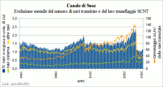 Last year, ship traffic in the Suez Canal recorded a decrease of -3.4% as 12,758 ships passed compared to to 13,213 in 2024. In 2025, transits in the Egyptian channel have started to show a recovery in the last two months of the following year that some shipping companies have begun to report the ships on the route that crosses it, that this had been abandoned following attacks on ships that the Houthis had started conducting since the end of 2023 in the region of Red Sea and the Bab el-Mandeb Strait. However, transits totals that occurred in 2025 are still -51.7% lower compared to those of 2023, when the record was reached with 26,434 transits, and -46.5% compared to those of 2022 when the crisis had not yet begun.