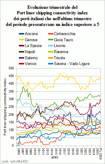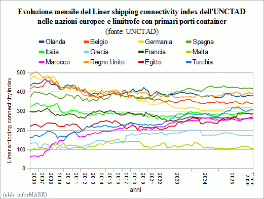 In the first trimester of this year the index of connection of Italy and its ports to the network of marine lines world that transport container has recorded a slight increment of +0.4% on the same period of 2025 being its Liner Shipping Connectivity Index (LSCI), the index defined from the United Nations Conference on Trade and Development (UNCTAD), pairs to 288,3, figure that has as reference the average value of 100 of the relative harbour connectivity Among the European and neighbouring nations to have accused the most significant decrease of the index was Greece with an index of 172,4 (-7.8%) followed by Spain with 419,3 (-2.1%) and Holland with 381,0 (-1.9%). To have marked the increase, instead, is Egypt with an index LSCI of 286,3 (+9.0%) followed by Denmark with 93,2 (+8.1%), Sweden with 124,0 (+6.4%), Malta with 108,4 (+3.8%), Portugal with 184,0 (+3.5%), Turkey with 307,1 (+3.3%), Croatia with 63,2 (+3.3%), Poland with 135,7 (+2.9%), Germany with 320 Nearly stable, in addition to Italy, the LSCI indices of United Kingdom (394.0; +0.7%), Slovenia (76.3; +0.5%), France (267.3; +0.5%) and Belgium (342.2; -0.1%).