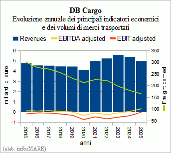 In 2025 all operating units of the German railway group Deutsche Bahn have recorded an operating profit except for the division of goods and logistics DB Cargo, whose annual operating result has been of sign negative even if in improvement regarding 2024 in front, however, of an increase of the bending of the revenues. The latter amounted to 4.97 billion euros, with a decrease of -8.0% on 2024. The adjusted gross operating margin was 321 million (+386,4%) and the adjusted operating income was -7 million compared to -357 million euros in the previous year.