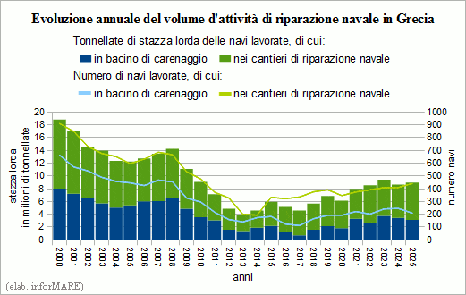 Lo scorso anno sono state 650 le navi sottoposte a riparazioni in Grecia, con un calo del -0,9% sul 2024. La stazza lorda di queste navi era di 8,97 milioni di tonnellate (+3,5%). Del totale, 441 navi (+7,6%) per 5,85 milioni di tsl (+12,1%) sono state sottoposte a lavori mentre erano in banchina o in rada che riguardavano principalmente le parti dell'opera morta delle navi, mentre gli interventi di riparazione su 209 navi (-15,0%) per 3,11 milioni di tsl (-9,5%) sono stati eseguiti principalmente sullo scafo nei bacini di carenaggio.