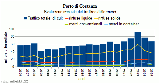 L’année dernière, le port de Constance a traité 67,6 un million de tonnes de marchandises, avec une diminution de -12,8 % par rapport à 2024 était déterminée par la contraction des volumes dans tous les Principales catégories de produits à l’exception des biens qui, avec 5,4 millions de tonnes, a enregistré une croissance de +25,2 %. Le trafic de marchandises conteneurisées est s’élevait à 7,8 millions de tonnes (-25,7 %) et était Fabriqué avec une manutention de conteneurs de 831 131 EVP (-16,0%). Échanges de cargaisons secs et liquides en vrac marquées Des diminutions de -14,3 % et -11,1 % respectivement, tombant à 36,9 % un million et 17,4 millions de tonnes.