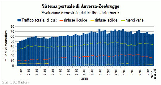 In the first quarter of this year, freight traffic in the Antwerp-Bruges port system amounted to 65.5 million tons, with a decrease of -3.2% over the same period in 2025 that - noted the Belgian Port Authority - must be contextualized both in relation to the comparison with a beginning of 2025 when the restructuring of the alliances of the shipping companies of the container sector had generated high volumes of inbound both with regard to the effects of weaker exports from Western Europe. The Port Authority recalled, In addition, the beginning of 2026 was characterized by extreme weather conditions, with a snowstorm and a prolonged cold spell in January followed by strong storms in the Bay of Biscay until mid-February which interrupted both maritime and terminal operations. This has been achieved added a four-day strike against the reform of the pensions.